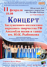 Дорогие друзья, приглашаем Вас на концерт Заслуженного коллектива народного творчества РФ Ансамбля песни и танца им. Ю. К. Рыбникова 11 февраля в 18:00!